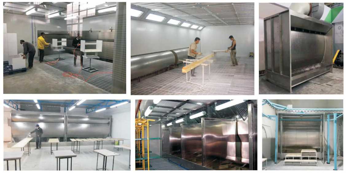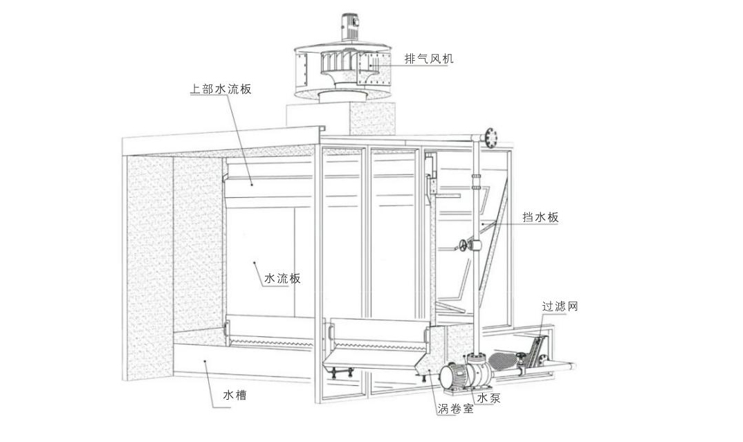 環保型水幕柜主要是由自吸水泵循環抽水往水簾板上均勻的流下來,使噴槍噴出來的漆霧和打磨產生的大顆粒粉塵被水簾板上的水打到下面水池里。再有少部分細微的漆霧和粉塵顆粒被末端的風機引入高效過濾器,通過排風管道排出車間外面或進行高空排放。